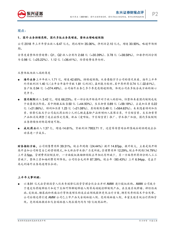 本报告的核心观点是:翰宇药业2018年半年度业绩略超预期,主要得益于国外业务的持续亮眼和国内多肽业务的高速增长。公司在多肽领域的深耕和研发实力是其核心竞争力,未来有望受益于注射剂一致性评价政策和优先审批等政策。
