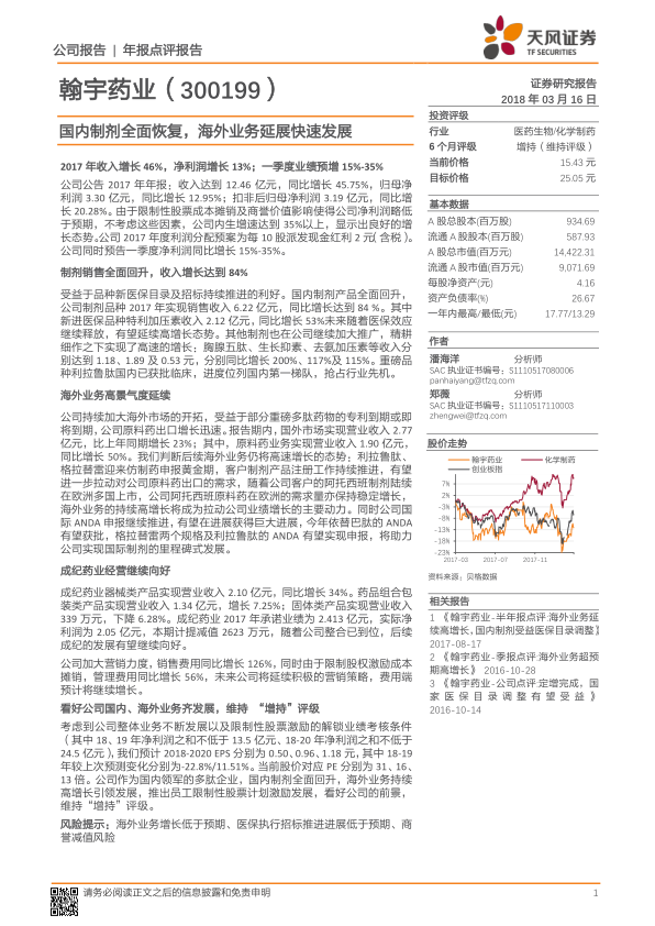 翰宇药业在2017年展现出强劲的增长势头,营业收入和净利润均实现大幅提升。国内制剂业务受益于新医保目录和市场推广,多个核心品种实现高速增长;海外业务则抓住多肽药物专利到期机遇,原料药出口和国际ANDA申报取得显著进展,成为公司业绩增长的重要驱动力。尽管公司为市场拓展加大了营销和管理费用投入,且成纪药业存在业绩承诺未达标并计提减值的情况,但整体而言,翰宇药业在产品线布局和国际化战略上取得了积极成效。鉴于公司作为国内多肽领域的领军企业,其国内、海外业务的协同发展以及股权激励计划的推动,预计未来业绩将持续增长。因此,报告维持了对翰宇药业的“增持”投资评级,并建议投资者关注海外业务增长、医保政策执行及商誉减值等潜在风险。