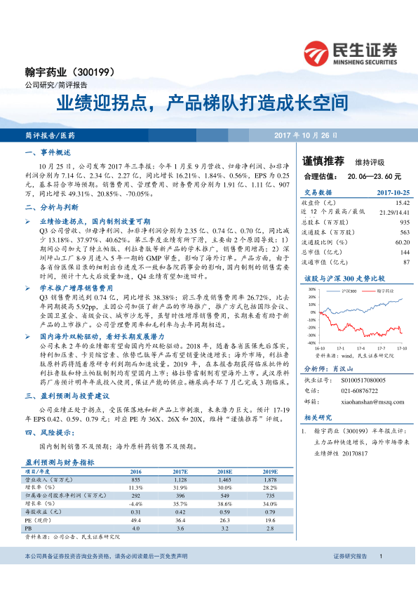 翰宇药业正迎来业绩拐点,受益于医保落地和新产品上市,公司未来增长潜力巨大。报告维持“谨慎推荐”评级,并预测公司17-19年EPS分别为0.42元、0.59元和0.79元。