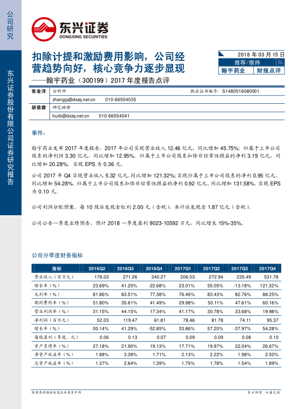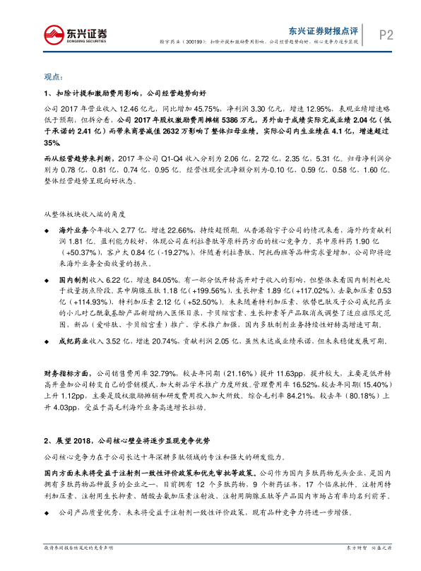 本报告对翰宇药业2017年业绩进行了回顾,并分析了公司未来的发展潜力。报告认为,公司虽然受到一些短期因素的影响,但整体经营趋势向好,核心竞争力逐步显现。公司在多肽领域的深耕和研发优势,以及受益于政策和市场机遇,有望在未来三年实现业绩的快速增长。维持“推荐”评级。