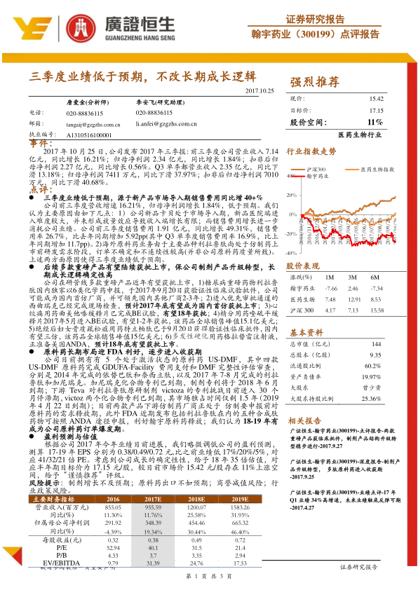 本报告分析了翰宇药业2017年三季度业绩低于预期的原因,主要归结于新产品市场导入期销售费用大幅增长以及海外原料药业务订单的不确定性。尽管短期业绩承压,但公司后续多款重磅产品有望陆续获批上市,原料药长期布局迎来FDA利好,长期成长逻辑确定性高。