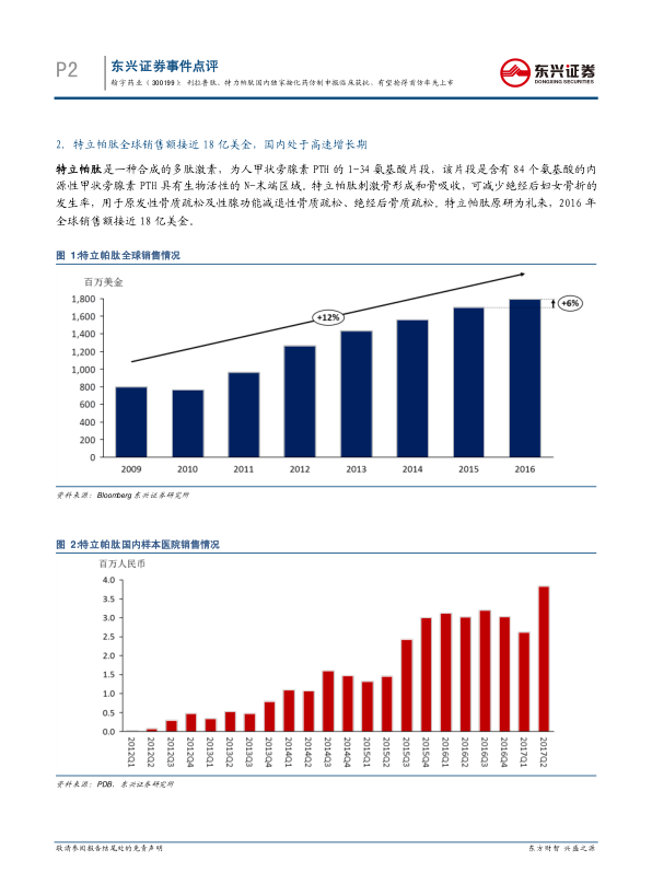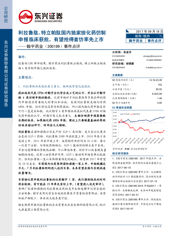 本报告分析了翰宇药业利拉鲁肽和特立帕肽国内独家按化药仿制申报临床获批的事件,认为这代表着CFDA对翰宇药业全化学合成工艺和化药申报路径的认可,有望使其在GLP-1药物和骨质疏松药物市场中抢得首仿先机。同时,报告也展望了翰宇药业国内制剂业务的增长潜力,以及海外业务的稳健发展,维持“推荐”评级。