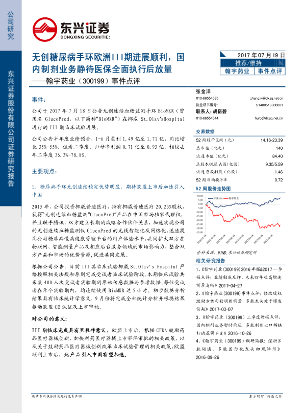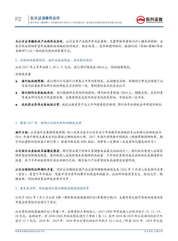 本报告对翰宇药业进行了深入分析,认为公司在无创血糖监测手环、海外业务拓展和国内市场放量等方面具有显著优势。股权激励计划的实施为公司未来发展提供了明确的目标和动力。预计公司2017-2019年归母净利润将保持高速增长,维持“推荐”评级。同时,报告也提示了海外原料药业务低于预期、爱啡肽ANDA低于预期、成纪商誉减值损失等风险。
