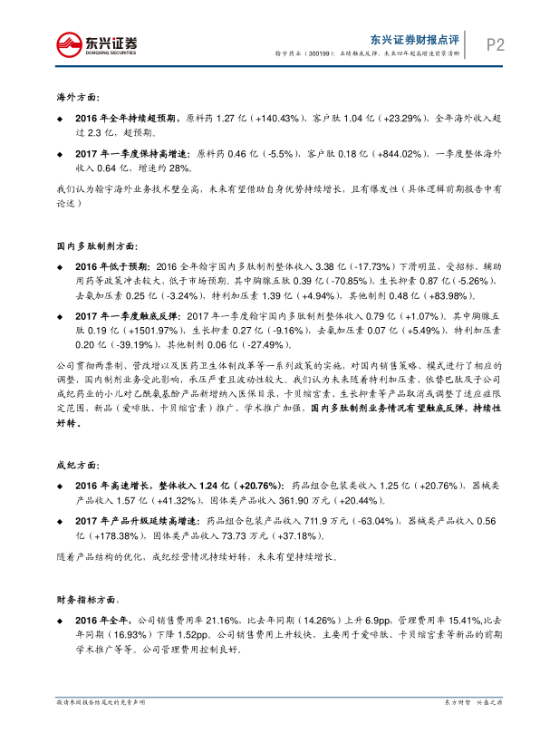 本报告对翰宇药业的财务数据和业务发展进行了深入分析,认为公司在经历2016年的业绩低谷后,有望在未来四年实现超高增速。这主要得益于海外业务的持续超预期增长、国内多肽制剂业务的触底反弹以及股权激励方案的保障。公司在多肽领域的深耕和国际化战略的推进,使其有望成为多肽国际化龙头。维持“推荐”评级。