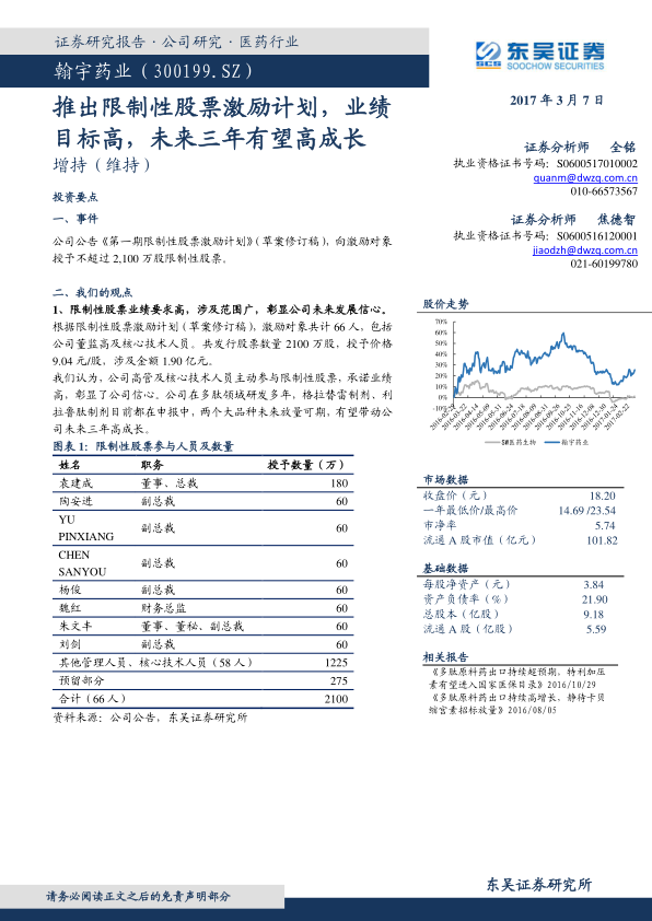 公司推出限制性股票激励计划,激励对象包括公司董监高及核心技术人员共计66人,发行股票数量2100万股,授予价格9.04元/股。该计划业绩要求高,彰显了公司对未来发展的信心。公司在多肽领域研发多年,格拉替雷制剂、利拉鲁肽制剂目前都在申报中,两个大品种未来放量可期,有望带动公司未来三年高成长。