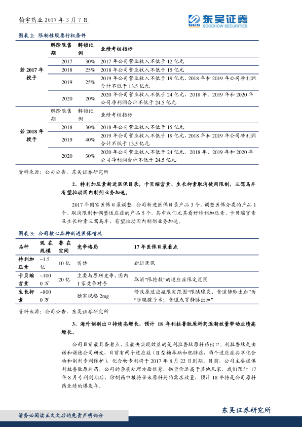 2017年国家医保目录调整,公司多个产品受益。其中,特利加压素新进医保目录,卡贝缩宫素、生长抑素取消使用限制,这三款核心产品有望拉动国内制剂业务加速增长。