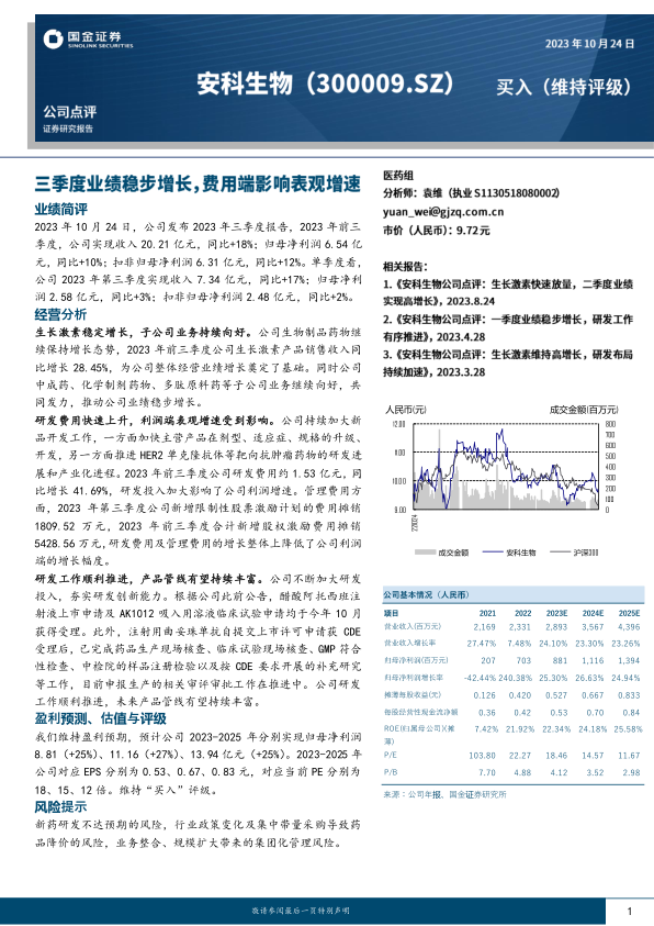 安科生物2023年前三季度业绩表现稳健,生长激素业务是主要增长动力,子公司业务也呈现良好态势。公司持续加大研发投入,有望丰富产品管线,但也对短期利润增速造成一定影响。维持“买入”评级,但需关注新药研发风险、行业政策变化以及集团化管理风险。