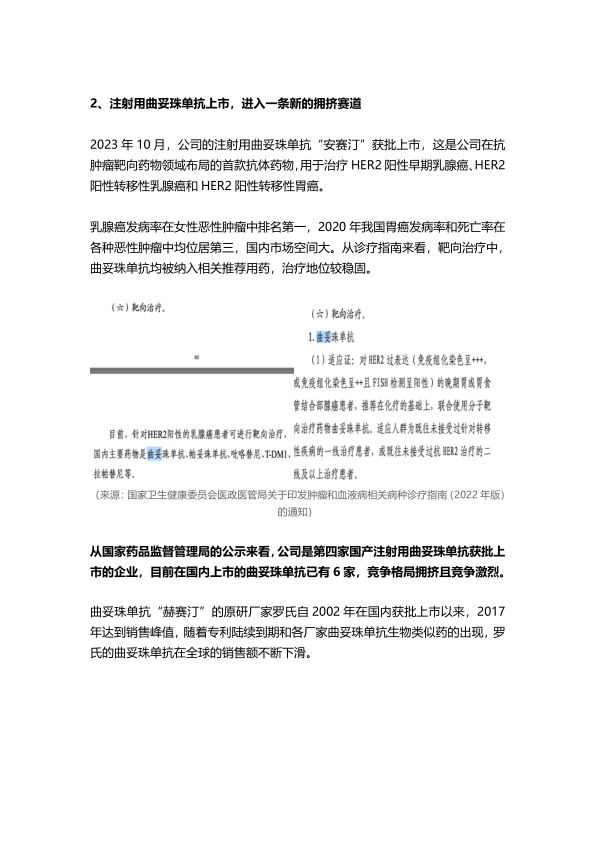2023年10月,公司公告其首款抗体药物注射用曲妥珠单抗获批上市,意味着曲妥珠单抗加入公司基因工程药阵营。