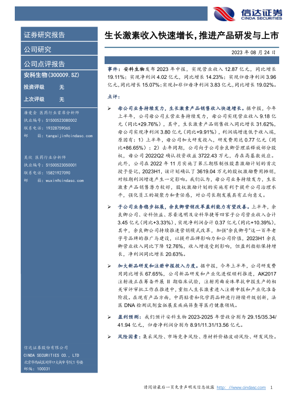 安科生物2023年中报显示公司业绩稳健增长,生长激素业务是主要驱动力。公司加大研发投入,积极推进新品研发和注册申报,同时实施股权激励计划,有利于提升公司治理水平,强化员工的凝聚力和责任感,对公司长期发展具有正向意义。 报告同时提示了集采风险、市场竞争风险、原材料价格波动风险和研发风险。