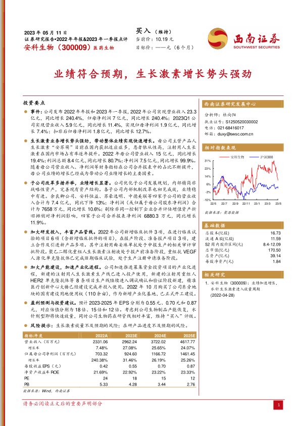 安科生物在2022年和2023年一季度表现良好,业绩增长主要得益于生长激素业务的强劲势头。公司通过子公司改革、加大研发投入和产能建设,不断丰富产品管线,加速产业化进程。报告维持对安科生物的“买入”评级,并提示了生长激素放量和在研产品进度不及预期的风险。总体而言,安科生物在生物制品领域具有较强的增长潜力。