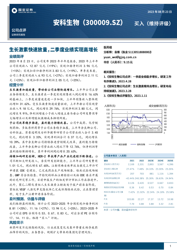 安科生物2023年上半年业绩表现良好,主要得益于生长激素产品的快速放量和子公司业务的稳步发展。公司持续加大研发投入,多个重点产品产业化进程顺利推进,为未来的业绩增长奠定了基础。维持“买入”评级,但需关注新药研发风险、行业政策变化以及集团化管理风险。