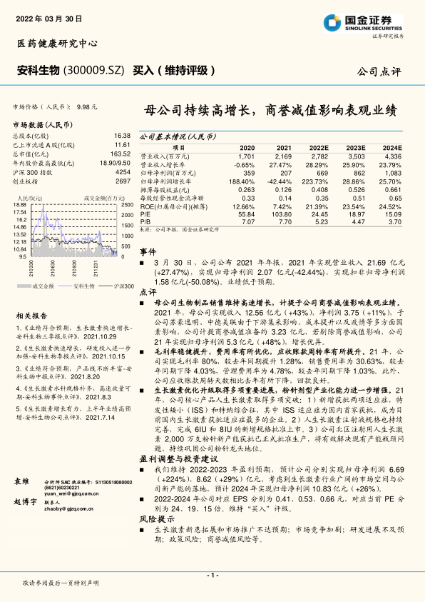 本报告对安科生物2021年业绩进行了分析,指出公司在生物制品销售方面保持增长势头,但受到商誉减值的影响。生长激素业务是公司发展的核心驱动力,公司在该领域取得多项重要进展。维持对公司“买入”评级,但需关注相关风险。