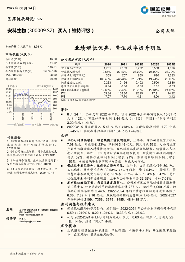 本报告分析了安科生物2022年中报及近期表现,并对其未来盈利能力进行预测,维持“买入”评级。