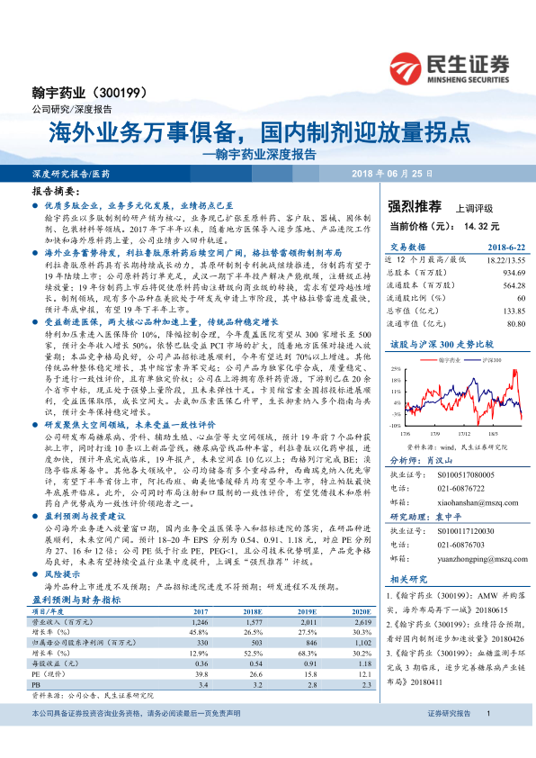 公司业绩增长的确定性主要来源于其全球化战略的深入推进和持续的研发创新。在海外市场,利拉鲁肽原料药受益于原研制剂专利到期和仿制药陆续上市,商业级需求空间广阔;格拉替雷制剂有望在2019年下半年上市,抢占多发性硬化市场。在国内市场,特利加压素和依替巴肽两大核心品种受益于医保目录调整和招标进院,预计2018年增速将超过50%。同时,公司研发聚焦糖尿病、骨科、辅助生殖、心血管等大空间领域,多个重磅品种研发进展顺利,有望在未来几年陆续获批上市。此外,公司积极布局注射剂和口服制剂一致性评价,凭借技术和原料药自产优势有望成为行业领跑者。通过并购AMW和与腾讯合作,公司进一步完善了海外市场布局和糖尿病全产业链平台建设,为长期发展奠定坚实基础。预计2018-2020年EPS分别为0.54、0.91、1.18元,对应PE显著低于行业平均,投资价值突出。