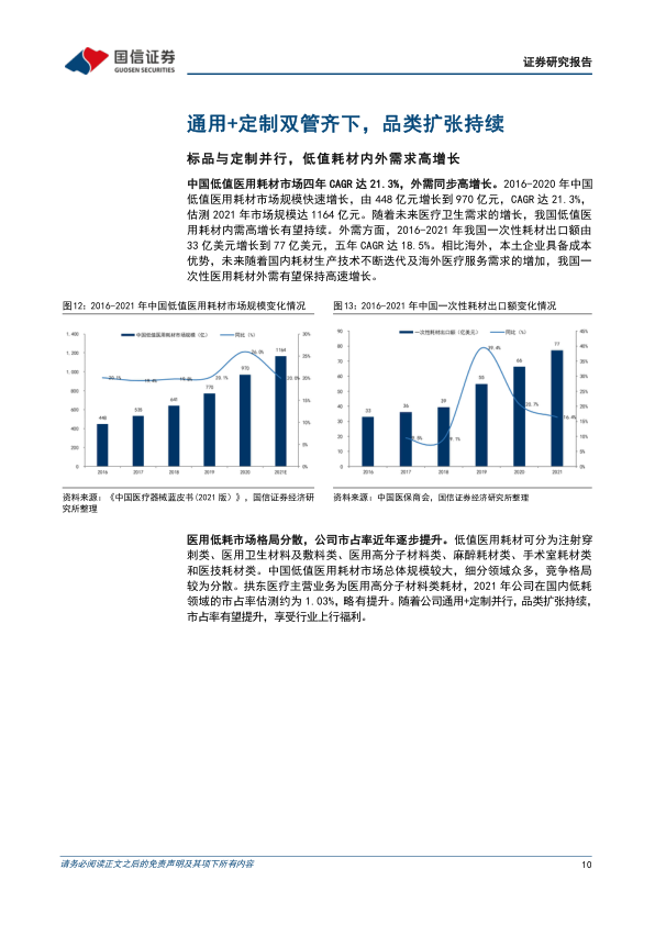 医用低耗市场千亿,公司为行业领先企业。医用低耗内外需求高增长,2021年国内市场规模1164亿元,四年复合增速约21%,行业细分领域众多、竞争格局分散。公司在医用低耗领域市占率约为1%,已形成近4000种规格的产品体系,是国内医用低耗行业产品种类最全、规模最大的企业之一。