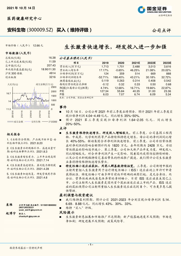 基于公司强劲的业绩增长、核心产品的市场拓展以及研发投入的持续加强,国金证券维持对安科生物的“买入”评级。
