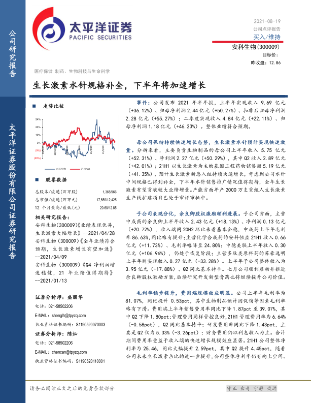 安科生物2021年上半年业绩表现稳健,生长激素业务增长迅速,水针规格补全有望加速下半年增长。公司在创新药研发方面持续投入,多个项目取得重要进展。维持“买入”评级,但需关注生长激素集采、研发风险及市场竞争加剧等风险因素。
