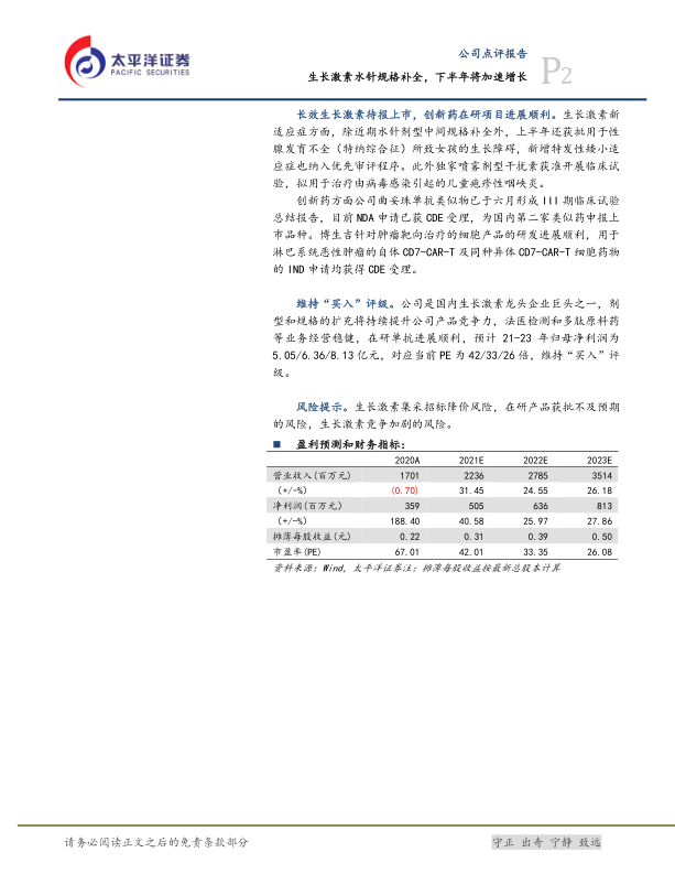 维持“买入”评级。公司是国内生长激素龙头企业巨头之一,剂型和规格的扩充将持续提升公司产品竞争力,法医检测和多肽原料药等业务经营稳健,在研单抗进展顺利,预计21-23年归母净利润为5.05/6.36/8.13亿元,对应当前PE为42/33/26倍,维持“买入”评级。
