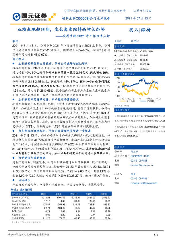 随着产能释放、剂型完善,公司生长激素将进入业绩收获期,股权激励进一步激发子公司活力并聚焦主业,我们预计 21-23 年营业收入为 22.43、 28.24和 35.16 亿元,预计归母净利润为 5.32、7.23 和 9.83 亿元,对应 EPS 分别 0.32/0.44/0.60 元/股,对应 PE 分别为 50/36/27 倍, 维持“买入”评级。