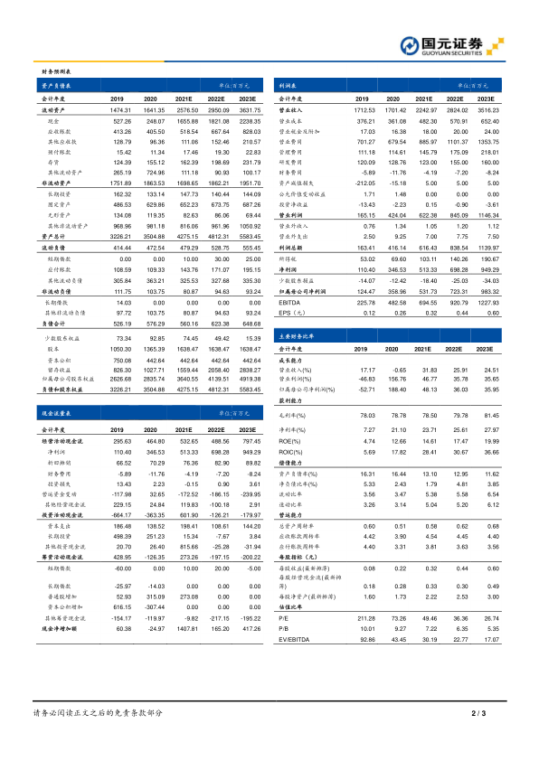 预计21-23年营业收入为22.43、28.24和35.16亿元,预计归母净利润为5.32、7.23和9.83亿元,对应EPS分别为0.32/0.44/0.60元/股,对应PE分别为50/36/27倍,维持“买入”评级。