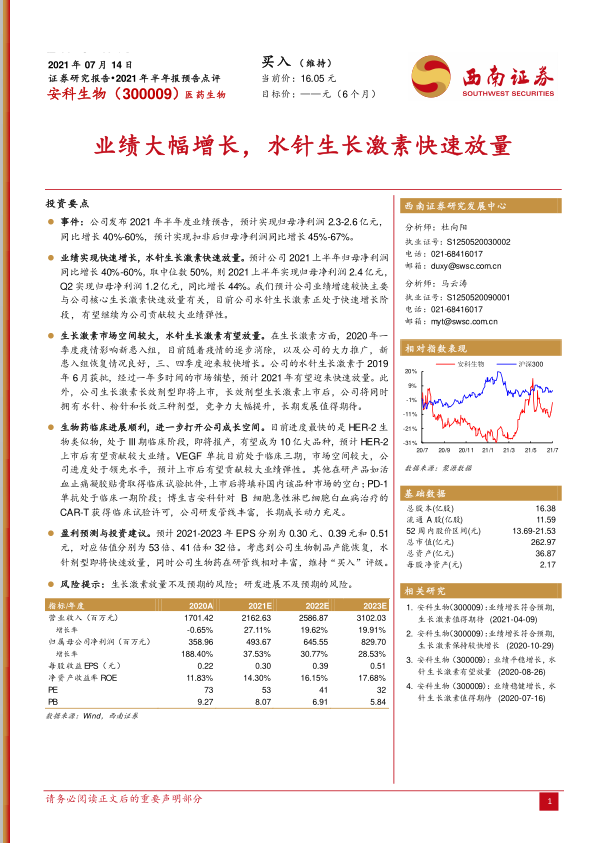 安科生物2021年上半年业绩预告显示出强劲的增长态势,主要得益于水针生长激素的快速放量。公司在生长激素领域通过多剂型布局,特别是即将上市的长效剂型,将进一步提升市场竞争力。同时,其丰富的生物药研发管线,包括HER-2生物类似物和VEGF单抗等重磅产品,正顺利推进临床试验,有望在未来成为新的业绩增长点。尽管存在生长激素放量和研发进展不及预期的风险,但整体来看,公司凭借核心业务的增长和创新管线的拓展,展现出良好的长期成长潜力,维持“买入”评级。