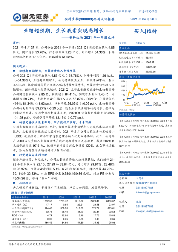 本报告对安科生物2021年一季报的分析表明,公司业绩超预期增长,生长激素业务是主要驱动力。公司在生长激素领域的持续投入和布局,以及新产能的即将投产,都预示着公司未来业绩增长的潜力。维持“买入”评级,但同时也提示了产品研发、市场推广、产品安全和政策等方面的风险。