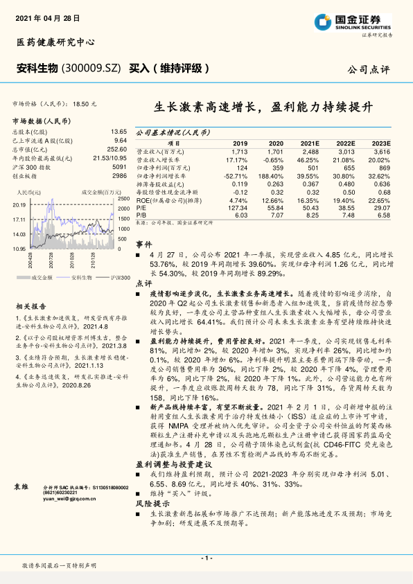 新产品线持续丰富,有望不断放量。 2021 年 2 月 1 日, 公司新增申报的注射用重组人生长激素用于治疗特发性矮小( ISS)适应症的上市许可申请,获得 NMPA 受理并被纳入优先审评。公司全资子公司安科恒益的阿莫西林颗粒生产注册补充申请以及头孢地尼颗粒生产注册申请已获得国家药监局受理通知书。 4 月 28 日,公司精子顶体染色试剂盒(抗 CD46-FITC 荧光染色法)获准生产销售,在男性不育检测产品线的布局不断完善。