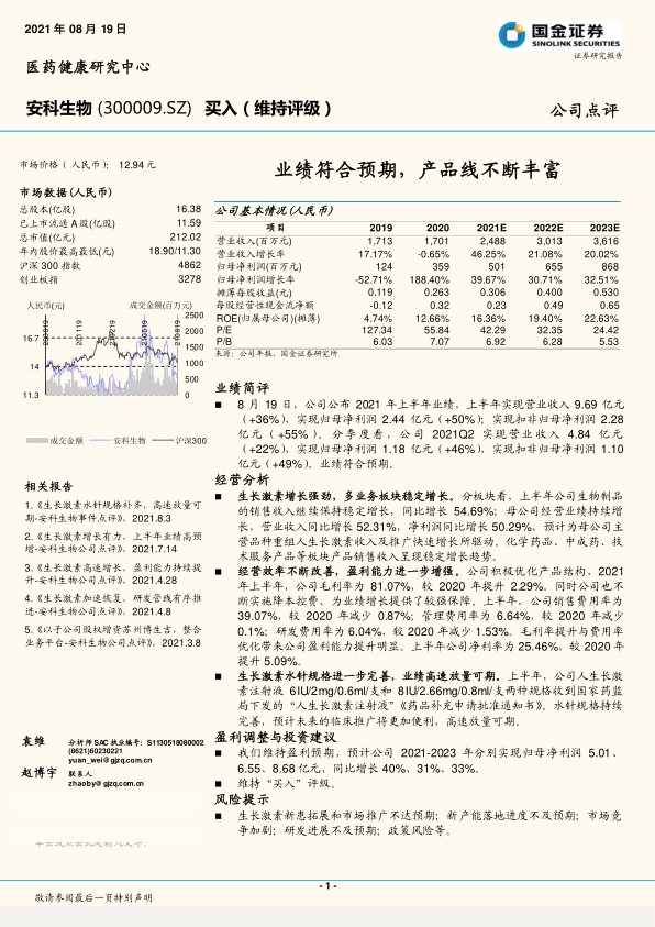 本报告分析了安科生物2021年上半年的业绩表现,指出公司业绩符合预期,生长激素业务增长强劲,多业务板块稳定增长,盈利能力进一步增强。公司通过优化产品结构和降本控费,实现了毛利率和净利率的提升。维持对公司未来盈利的乐观预期,维持“买入”评级,但同时也提示了相关风险。