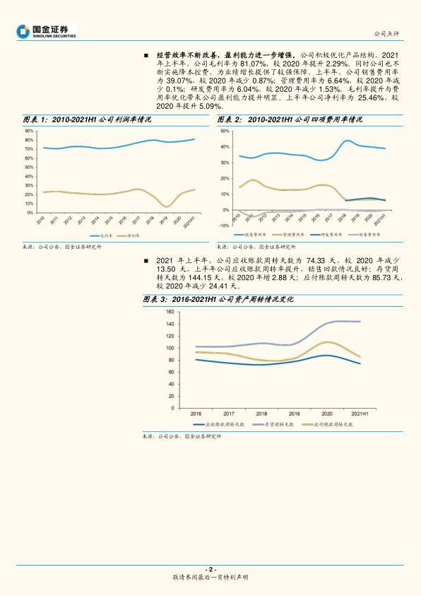 经营效率不断改善,盈利能力进一步增强。公司积极优化产品结构,2021年上半年,公司毛利率为81.07%,较2020年提升2.29%。同时公司也不断实施降本控费、为业绩增长提供了较强保障。上半年,公司销售费用率为39.07%,较2020年减少0.87%;管理费用率为6.64%,较2020年减少0.1%;研发费用率为6.04%,较2020年减少1.53%。毛利率提升与费用率优化带来公司盈利能力提升明显。上半年公司净利率为25.46%,较2020年提升5.09%。