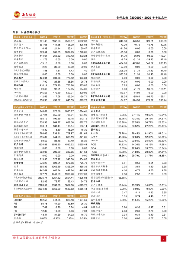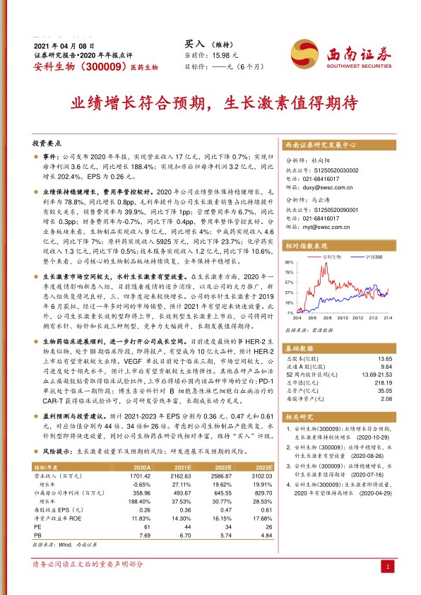 安科生物在2020年展现了强劲的盈利能力和有效的经营管理,归母净利润实现近两倍增长。其核心生物制品板块,特别是生长激素业务,在疫情影响后迅速恢复并有望在2021年实现水针剂型的快速放量。同时,长效生长激素剂型的即将上市以及HER-2生物类似物、VEGF单抗等创新生物药的顺利临床进展,为公司构建了坚实的长期增长基础和广阔的市场空间。财务预测显示,公司未来几年将保持营收和利润的持续增长,盈利能力和财务健康状况将进一步改善。基于这些积极因素,分析师维持“买入”评级,但投资者仍需关注生长激素放量和研发进展不及预期的潜在风险。