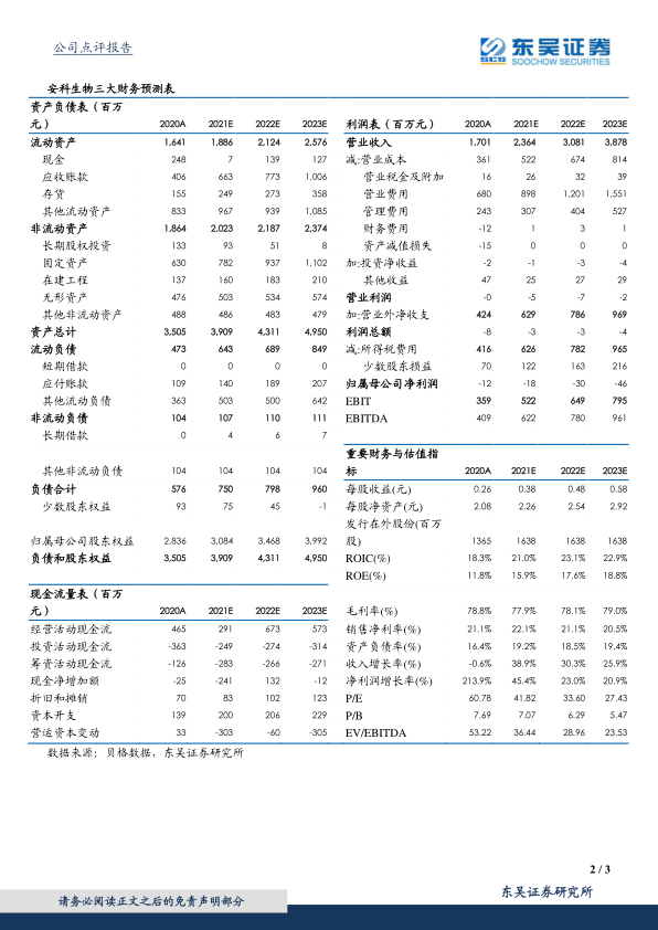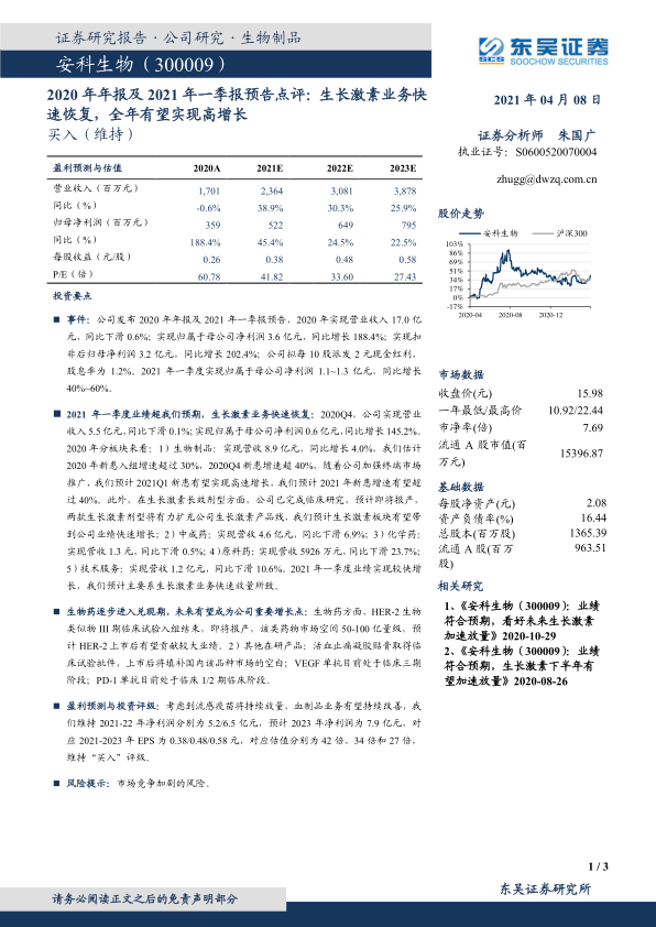 本报告对安科生物2020年年报及2021年一季报预告进行了深入分析,认为公司生长激素业务快速恢复,生物药逐步进入兑现期,未来有望成为公司重要增长点。报告维持了对公司未来三年业绩的盈利预测,并维持“买入”评级,建议投资者关注。