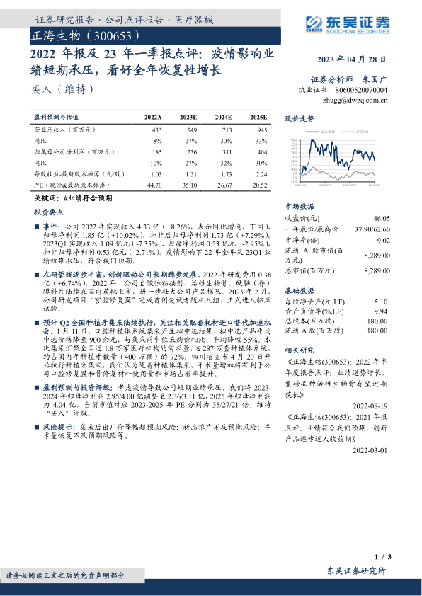 本报告分析了正海生物2022年及2023年一季度的业绩表现,认为公司短期业绩受到疫情影响,但长期来看,公司在研管线的丰富和创新产品的推出将驱动公司稳步发展。同时,种植牙集采的执行将为公司带来进口替代的机会。维持“买入”评级,但需关注集采降价、新品推广和手术量恢复等风险。