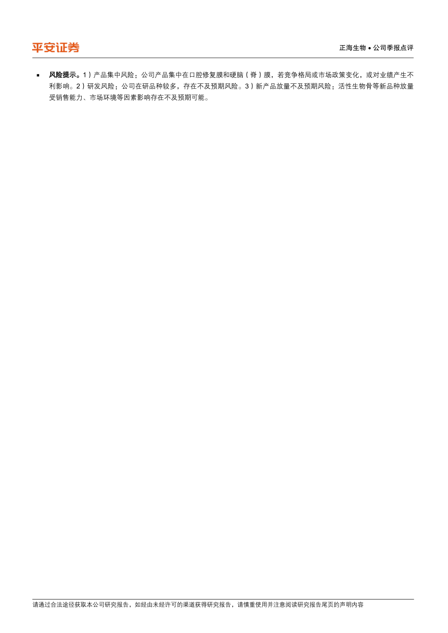 风险提示。1)产品集中风险:公司产品集中在口腔修复膜和硬脑(脊)膜,若竞争格局或市场政策变化,或对业绩产生不利影响。2)研发风险:公司在研品种较多,存在不及预期风险。3)新产品放量不及预期风险:活性生物骨等新品种放量受销售能力、市场环境等因素影响存在不及预期可能。
