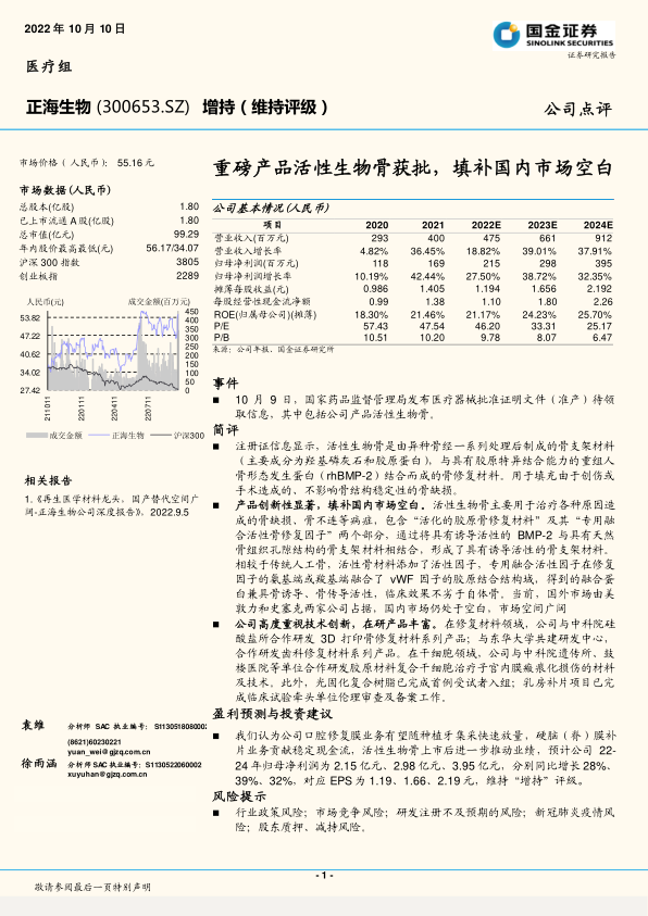 本报告分析了正海生物活性生物骨获批事件,认为该产品填补了国内市场空白,具有显著的创新性和广阔的市场潜力。结合公司在口腔修复膜和硬脑(脊)膜补片业务的优势,预计活性生物骨将成为公司未来业绩增长的重要驱动力。维持“增持”评级,但同时也提示了行业政策、市场竞争、研发注册、疫情以及股东风险等因素。