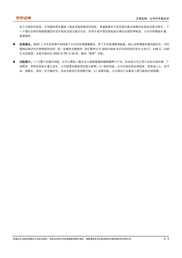 投资建议。2022上半年在疫情不利局面下公司仍实现稳健增长,若下半年疫情影响减弱,核心品种增速有望持续回升。同时重磅品种活性生物骨获批在即,进一步增加业绩弹性。我们维持公司2022-2024年归母净利润分别为2.23亿、2.99亿、3.60亿元的预测,当前市值对应2022年PE为40倍,维持“推荐”评级。