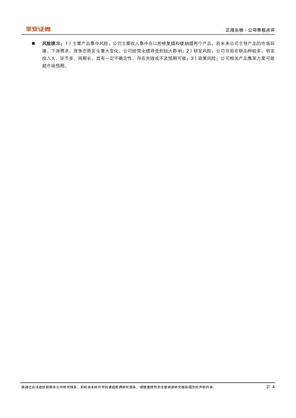 风险提示:1)主要产品集中风险:公司主要收入集中在口腔修复膜和硬脑膜两个产品,若未来公司主导产品的市场环境、下游需求、竞争态势发生重大变化,公司经营业绩将受到较大影响;2)研发风险:公司目前在研品种较多,研发投入大、环节多、周期长,具有一定不确定性,存在失败或不及预期可能;3)政策风险:公司相关产品集采力度可能超市场预期。