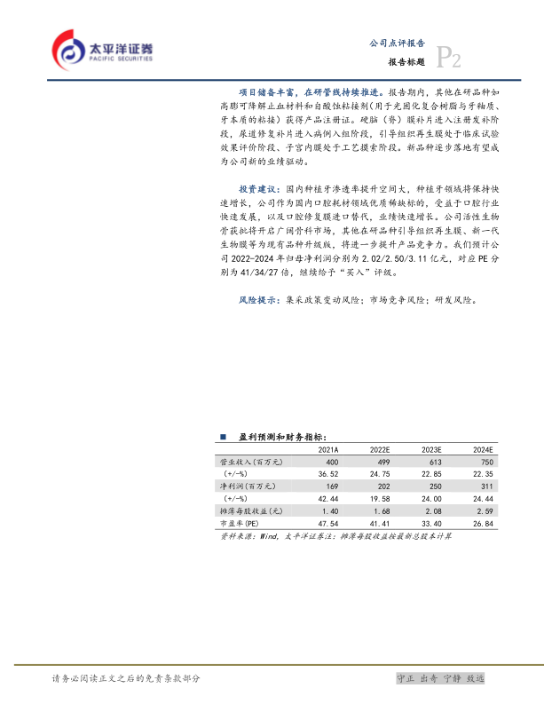 投资建议:国内种植牙渗透率提升空间大,种植牙领域将保持快速增长,公司作为国内口腔耗材领域优质稀缺标的,受益于口腔行业快速发展,以及口腔修复膜进口替代,业绩快速增长。公司活性生物骨获批将开启广阔骨科市场,其他在研品种引导组织再生膜、新一代生物膜等为现有品种升级版,将进一步提升产品竞争力。我们预计公司2022-2024年归母净利润分别为2.02/2.50/3.11亿元,对应PE分别为41/34/27倍,继续给予“买入”评级。