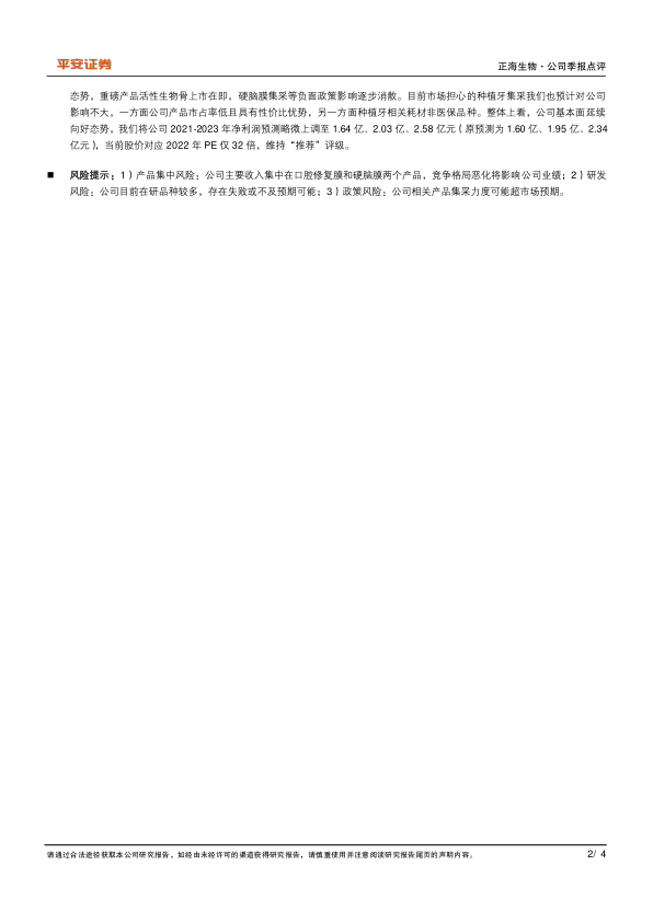公司基本面持续向好,维持“推荐”评级。公司核心产品保持稳健高增长态势,重磅产品活性生物骨上市在即,硬脑膜集采等负面政策影响逐步消散。目前市场担心的种植牙集采我们也预计对公司影响不大,一方面公司产品市占率低且具有性价比优势,另一方面种植牙相关耗材非医保品种。整体上看,公司基本面延续向好态势,我们将公司2021-2023年净利润预测略微上调至1.64亿、2.03亿、2.58亿元(原预测为1.60亿、1.95亿、2.34亿元),当前股价对应2022年PE仅32倍,维持“推荐”评级。