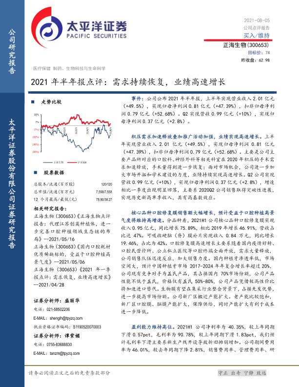 正海生物在2021年上半年实现了显著的业绩增长,主要得益于积压需求的释放和核心产品口腔修复膜的强劲表现。公司在口腔种植这一高景气度市场中占据优势,并通过高性价比产品加速进口替代。尽管Q2增速受高基数影响有所放缓,但公司整体盈利能力保持高位,且费用控制得当。展望未来,活性生物骨等丰富的在研管线有望开启新的市场空间,为公司提供持续的增长动力。综合来看,公司在口腔耗材领域的稀缺性和成长性使其具备长期投资价值,但投资者仍需关注集采政策、市场竞争及研发进展等潜在风险。