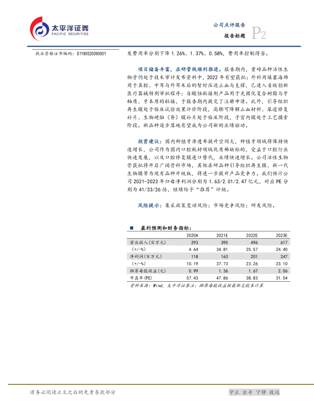 投资建议:国内种植牙渗透率提升空间大,种植牙领域将保持快速增长,公司作为国内口腔耗材领域优质稀缺标的,受益于口腔行业快速发展,以及口腔修复膜进口替代,业绩快速增长。公司活性生物骨获批将开启广阔骨科市场,其他在研品种引导组织再生膜、新一代生物膜等为现有品种升级版,将进一步提升产品竞争力。我们预计公司2021-2023年归母净利润分别为1.63/2.01/2.47亿元,对应PE分别为41/33/26倍,继续给予“推荐”评级。