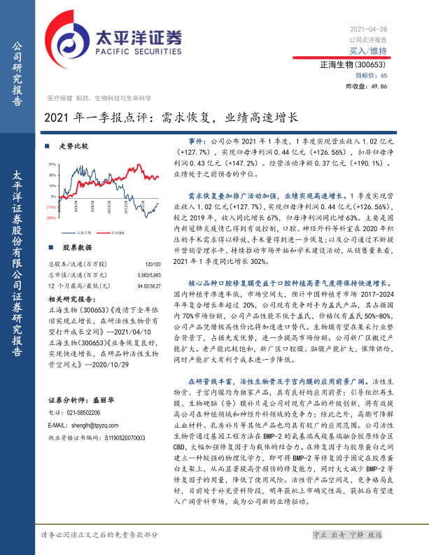 本报告分析了正海生物2021年一季报,指出公司业绩高速增长受益于疫情后需求恢复和市场推广加强。核心产品口腔修复膜受益于种植牙市场高景气度和进口替代加速,未来增长可期。同时,公司在研管线丰富,活性生物骨有望打开骨科市场新空间。维持“推荐”评级,但需关注集采政策、市场竞争和研发风险。
