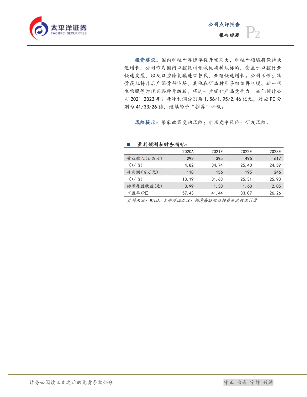 投资建议:国内种植牙渗透率提升空间大,种植牙领域将保持快速增长,公司作为国内口腔耗材领域优质稀缺标的,受益于口腔行业快速发展,以及口腔修复膜进口替代,业绩快速增长。公司活性生物骨获批将开启广阔骨科市场,其他在研品种引导组织再生膜、新一代生物膜等为现有品种升级版,将进一步提升产品竞争力。我们预计公司2021-2023年归母净利润分别为1.56/1.95/2.46亿元,对应PE分别为41/33/26倍,继续给予“推荐”评级。
