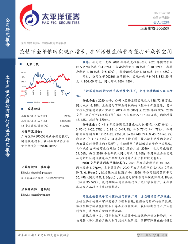 正海生物在2020年新冠疫情影响下,仍实现了营业收入和归母净利润的正增长,分别达到2.93亿元(+4.82%)和1.18亿元(+10.19%),显示出公司业务的强大韧性。同时,2021年第一季度业绩预告显示归母净利润同比增长100%~150%,预示着公司业务的快速恢复和增长潜力。