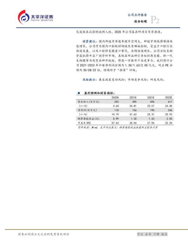 投资建议:国内种植牙渗透率提升空间大,种植牙领域将保持快速增长,公司作为国内口腔耗材领域优质稀缺标的,受益于口腔行业快速发展,以及口腔修复膜进口替代,业绩快速增长。公司活性生物骨获批将开启广阔骨科市场,其他在研品种引导组织再生膜、新一代生物膜等为现有品种升级版,将进一步提升产品竞争力。我们预计公司2021-2023年归母净利润分别为1.30/1.63/2.05亿元,对应PE分别为35/28/22倍,继续给予“推荐”评级。