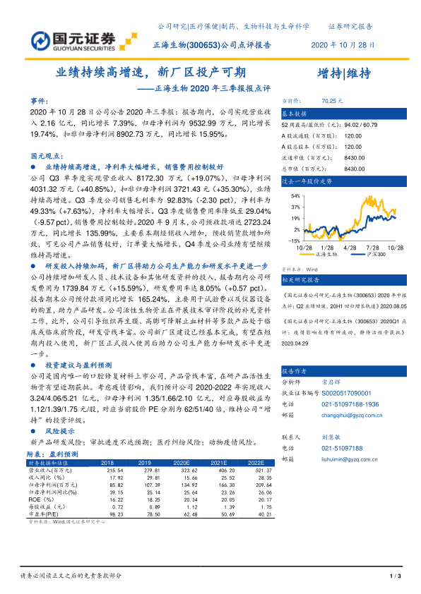 正海生物(300653)2020年三季报表现亮眼,业绩持续高增长,盈利能力显著提升。公司不断加大研发投入,新厂区即将投产,有望进一步提升生产能力和研发水平。维持“增持”评级,看好公司未来的发展前景。同时,报告也提示了新产品研发风险、审批进度不达预期、医疗纠纷风险以及动物疫情风险等潜在风险。