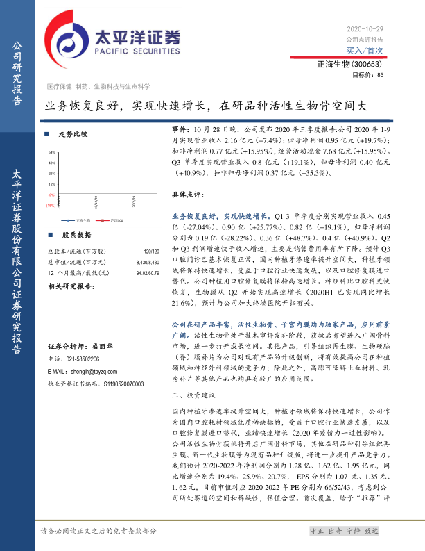 本报告对正海生物进行了公司点评,分析了其三季度业绩增长的原因,主要受益于口腔科和神经科业务的恢复以及种植牙渗透率的提升。公司在口腔修复膜进口替代方面具有优势,同时活性生物骨等在研产品具有广阔市场前景。报告首次覆盖,给予“推荐”评级,并预测了公司未来几年的盈利情况。同时,报告也提示了集采政策变动、市场竞争和研发风险。