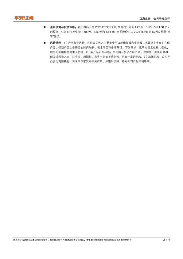 风险提示:1)产品集中风险:目前公司收入主要集中于口腔修复膜和生物膜,尽管拥有丰富的在研产品,但新产品上市需要的时间较长,若主导品种市场环境、下游需求、竞争态势发生重大变化,则公司业绩将受到重大影响;2)新产品研发风险:公司拥有多项在研产品,主要是三类医疗器械,研发过程投入大、环节多、周期长,具有一定的不确定性,存在一定的风险。3)政策风险:公司产品多为高值耗材,若未来国家发布相关政策,如限制价格,将对公司产生不利影响。