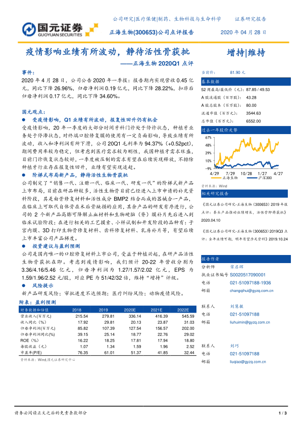 本报告认为,正海生物短期业绩受到疫情影响,但长期向好趋势不变。公司积极布局新产品,活性生物骨的获批值得期待。维持“增持”评级,但需关注新产品研发、审批进度、医疗纠纷和动物疫情等风险。