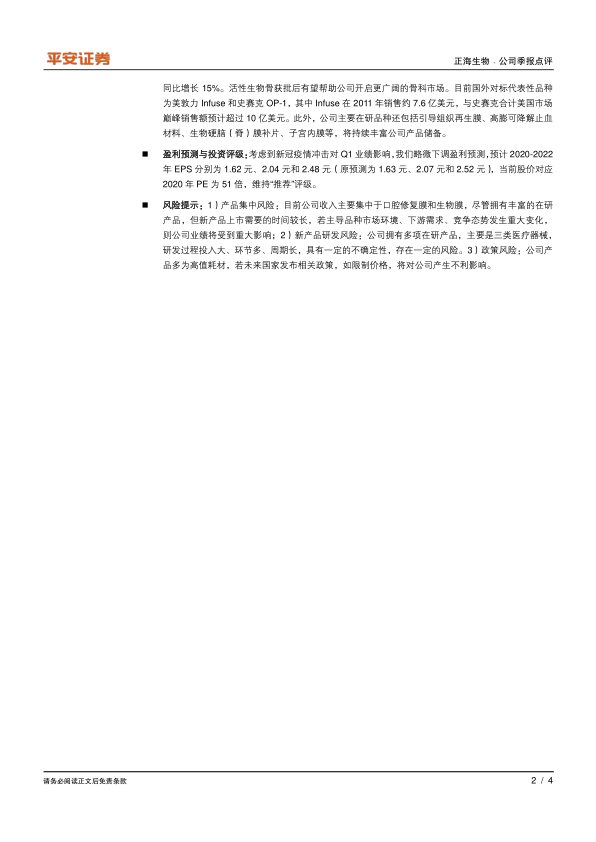 本报告对正海生物2020年一季报进行了点评,认为公司业绩受到新冠疫情的短期冲击,但长期来看,受益于神经外科和口腔科的刚性需求以及主要产品的市场竞争优势,公司业绩有望恢复增长。同时,活性生物骨等在研产品具有较大的市场潜力,有望成为公司新的增长点。报告维持“推荐”评级,但同时也提示了产品集中、新产品研发和政策风险。