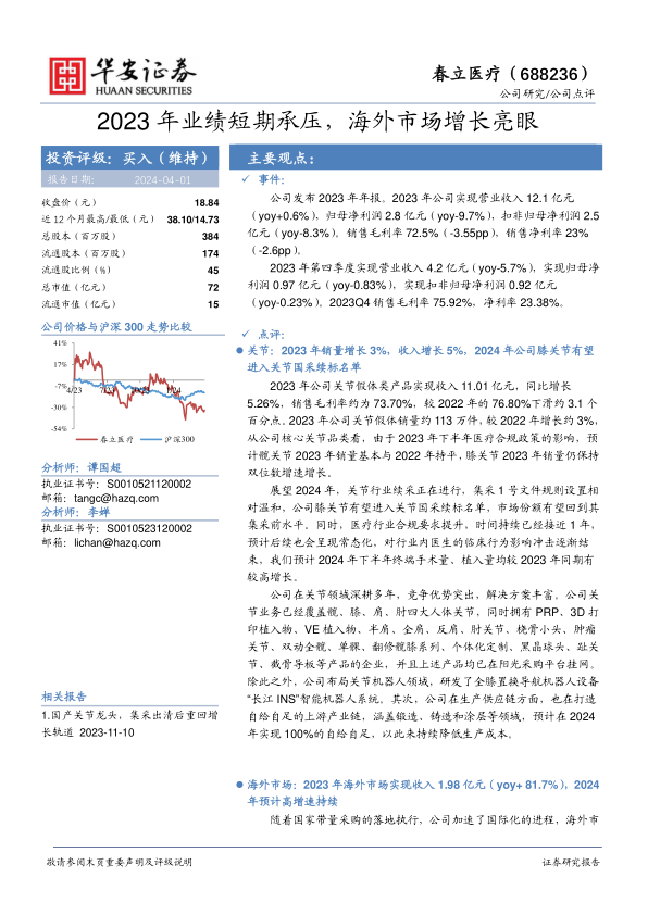 2023年,春立医疗的业绩受到医疗合规政策的影响,短期承压。但公司在海外市场表现亮眼,且关节业务有望在集采续标中受益,长期来看,公司发展前景良好。